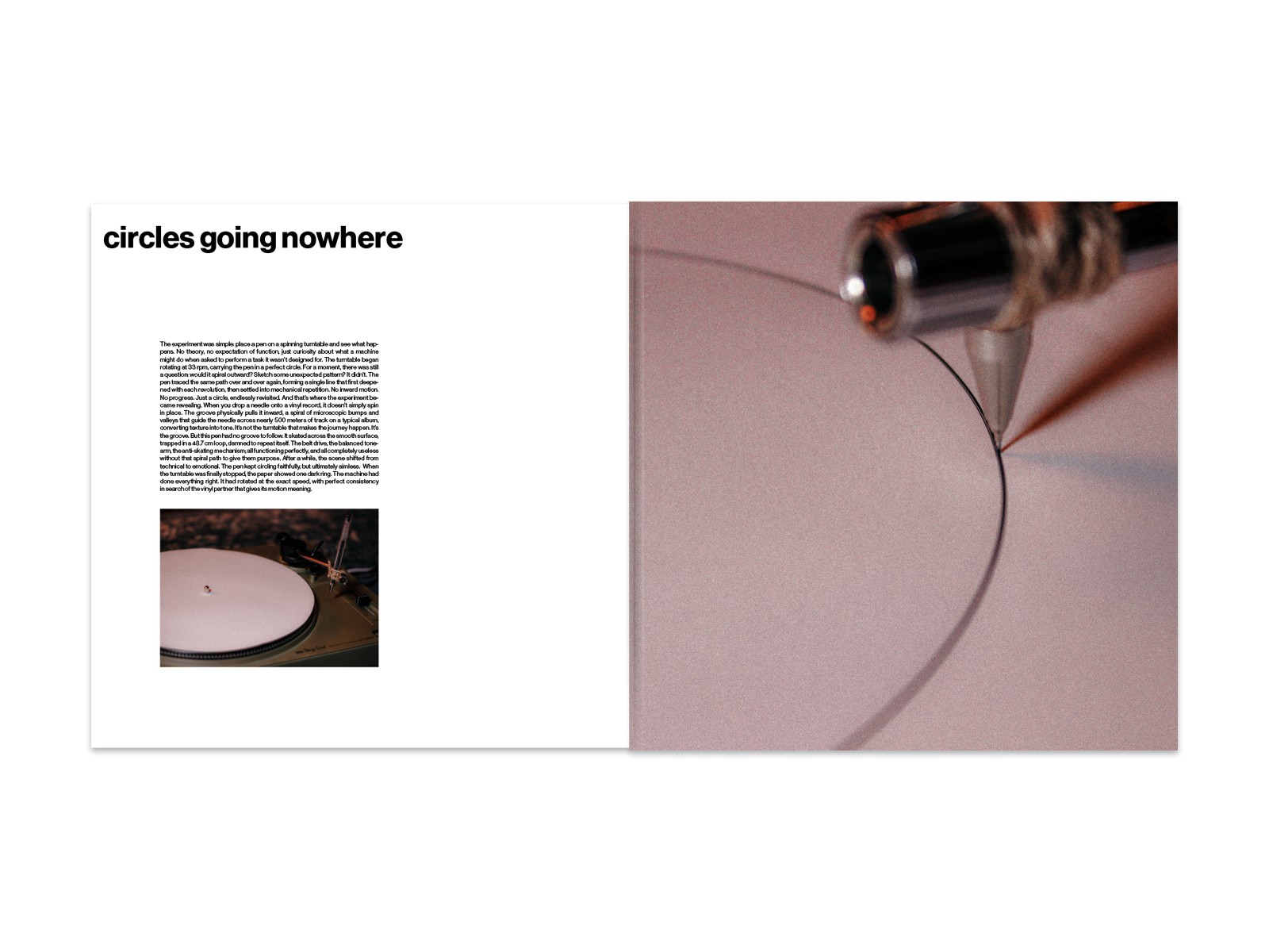 Inspired by Science of the Secondary by Atelier HOKO, our concept focused on observing the overlooked. We aimed to deconstruct the act of playing a record, from the touch of the needle to the movement of sound through space, and to translate these interactions into visual, textual, and experimental narratives within a magazine format.